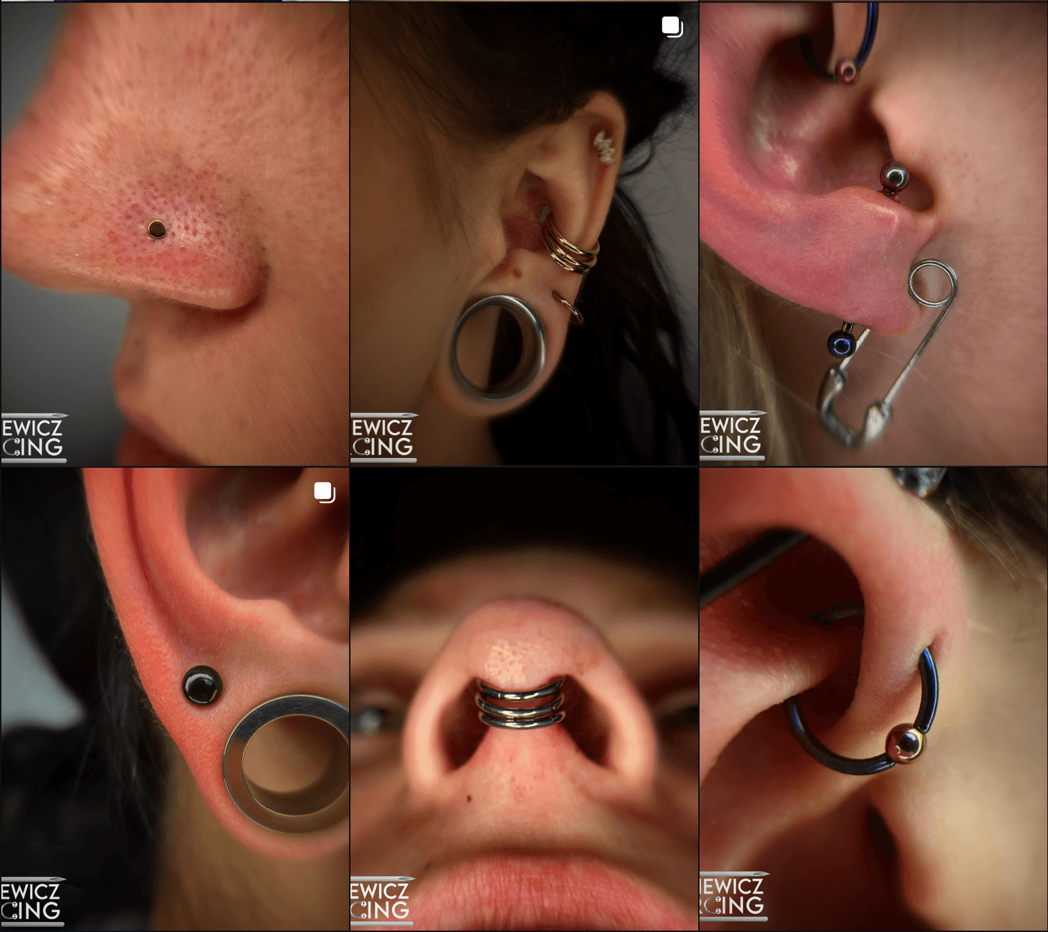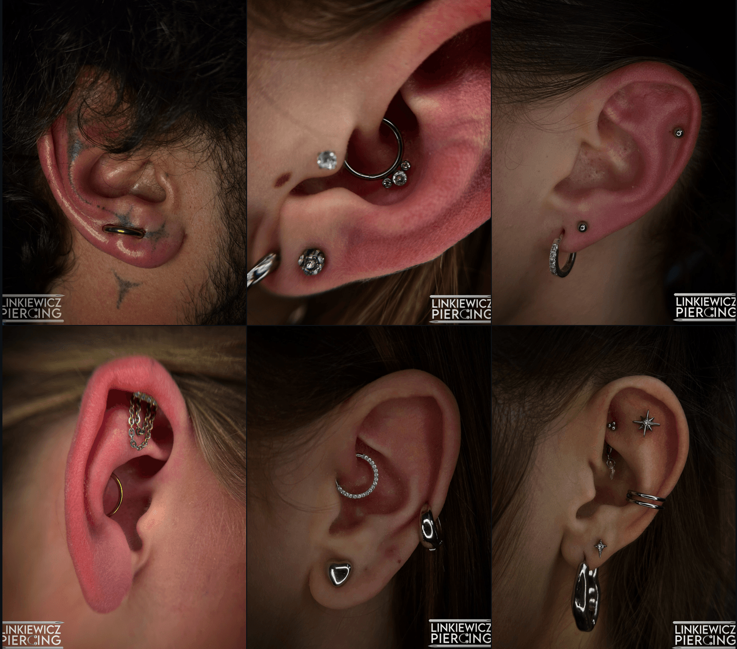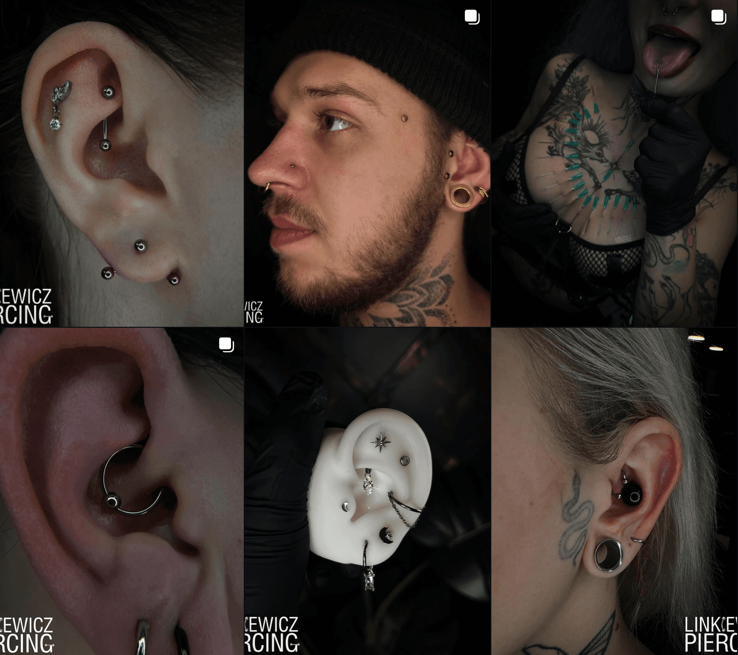 Oferuję pełen zakres profesjonalnych przekłuć, obejmujący klasyczne przekłucia uszu, takie jak płatek, helix, tragus, conch, industrial czy tunele, a także różne rodzaje piercingu nosa i twarzy, w tym nostril i septum.